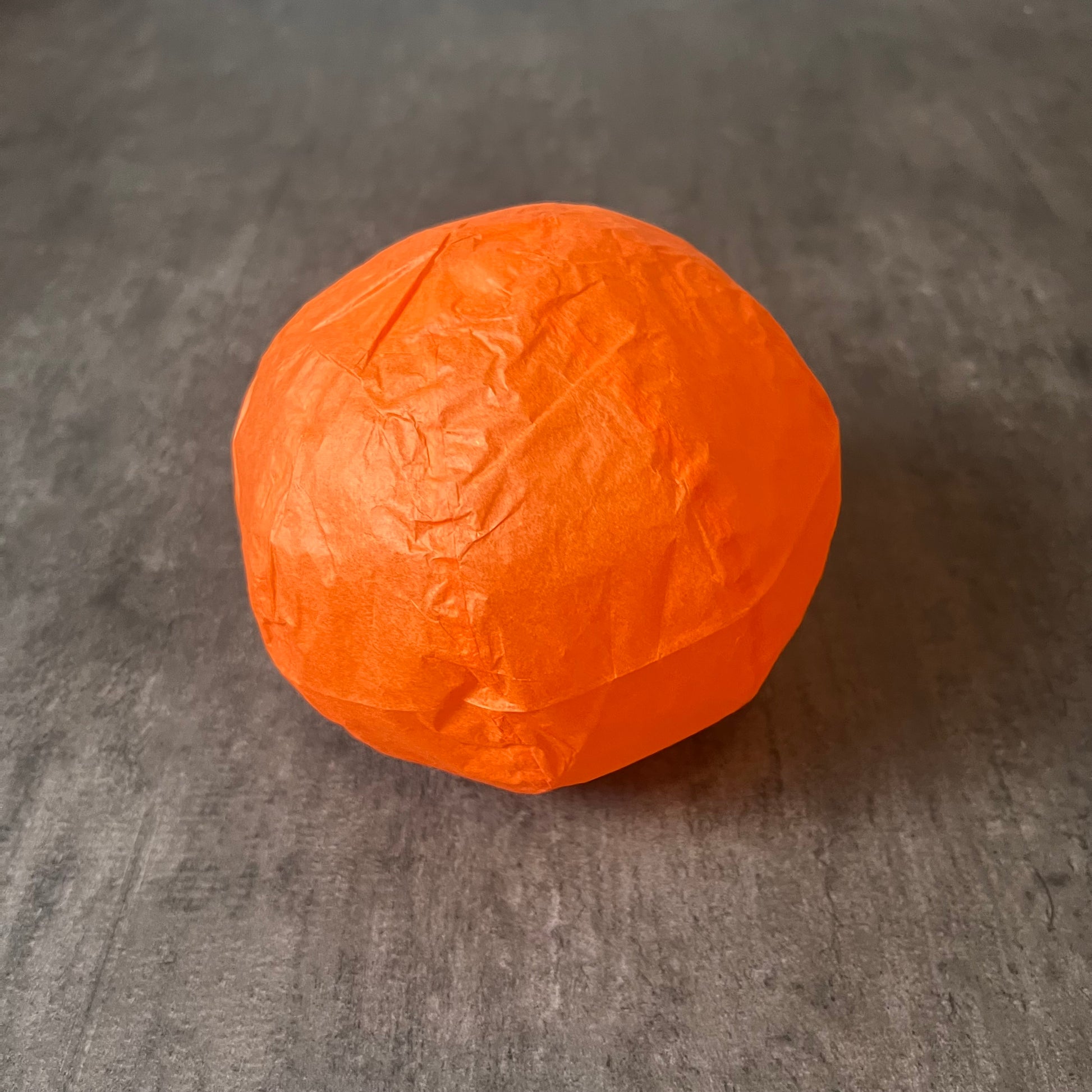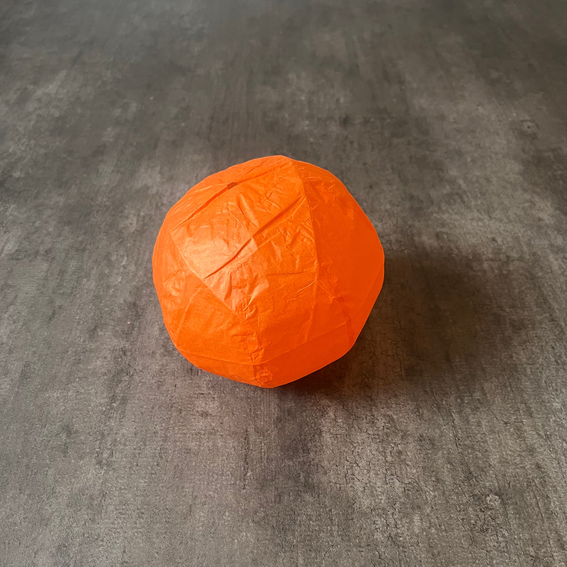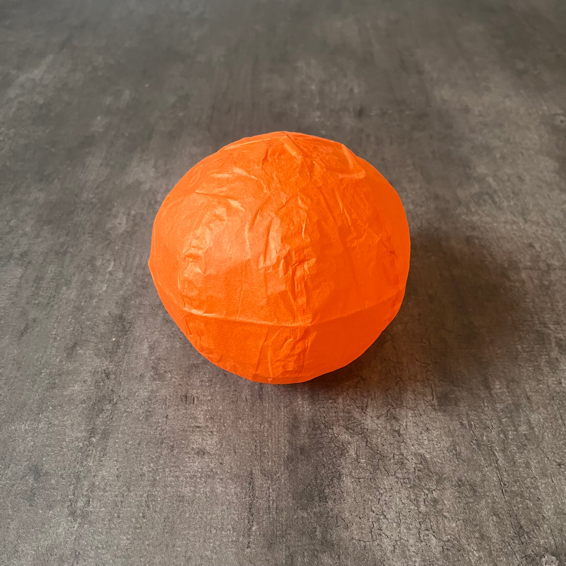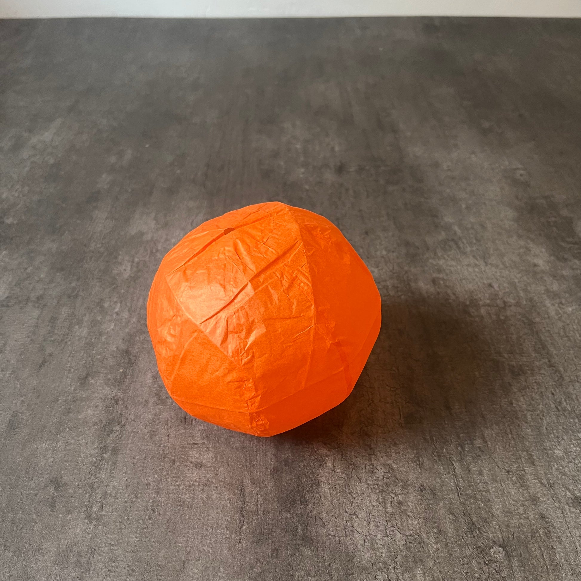 橙一色の紙風船。大変手間がかかる一色張り合わせ作業を行っています。
