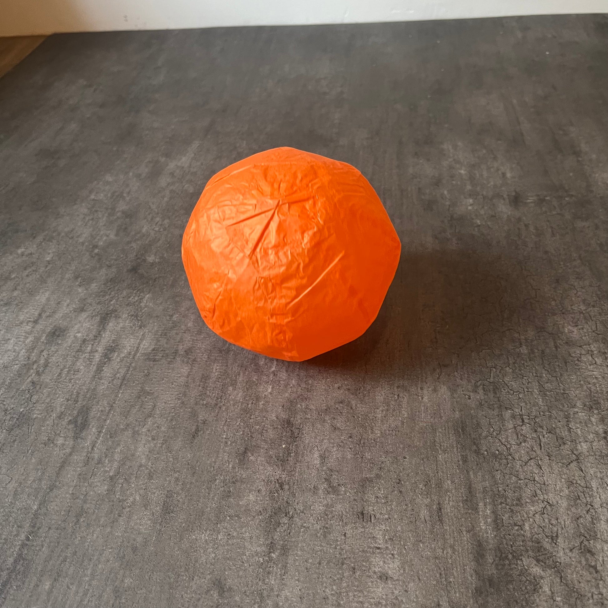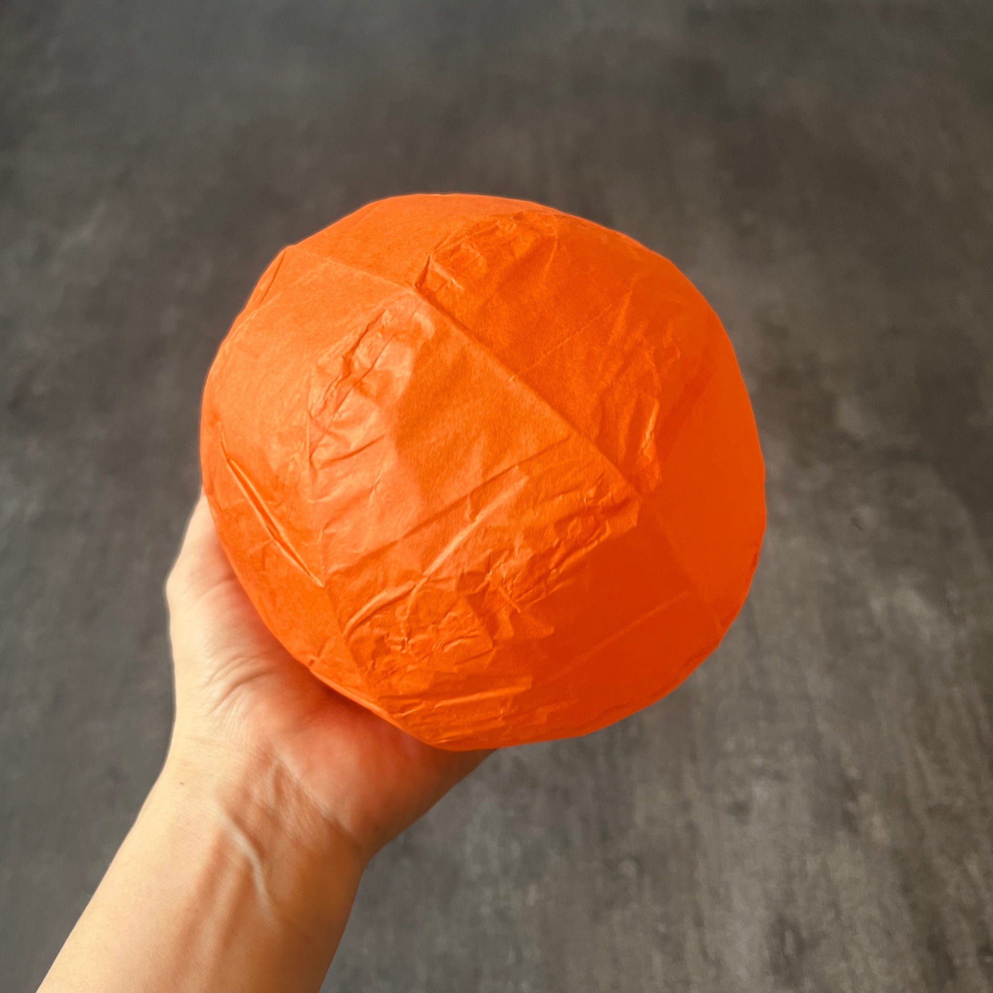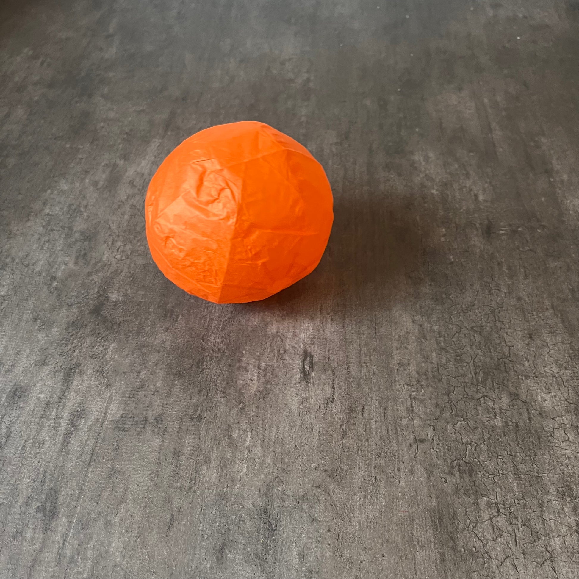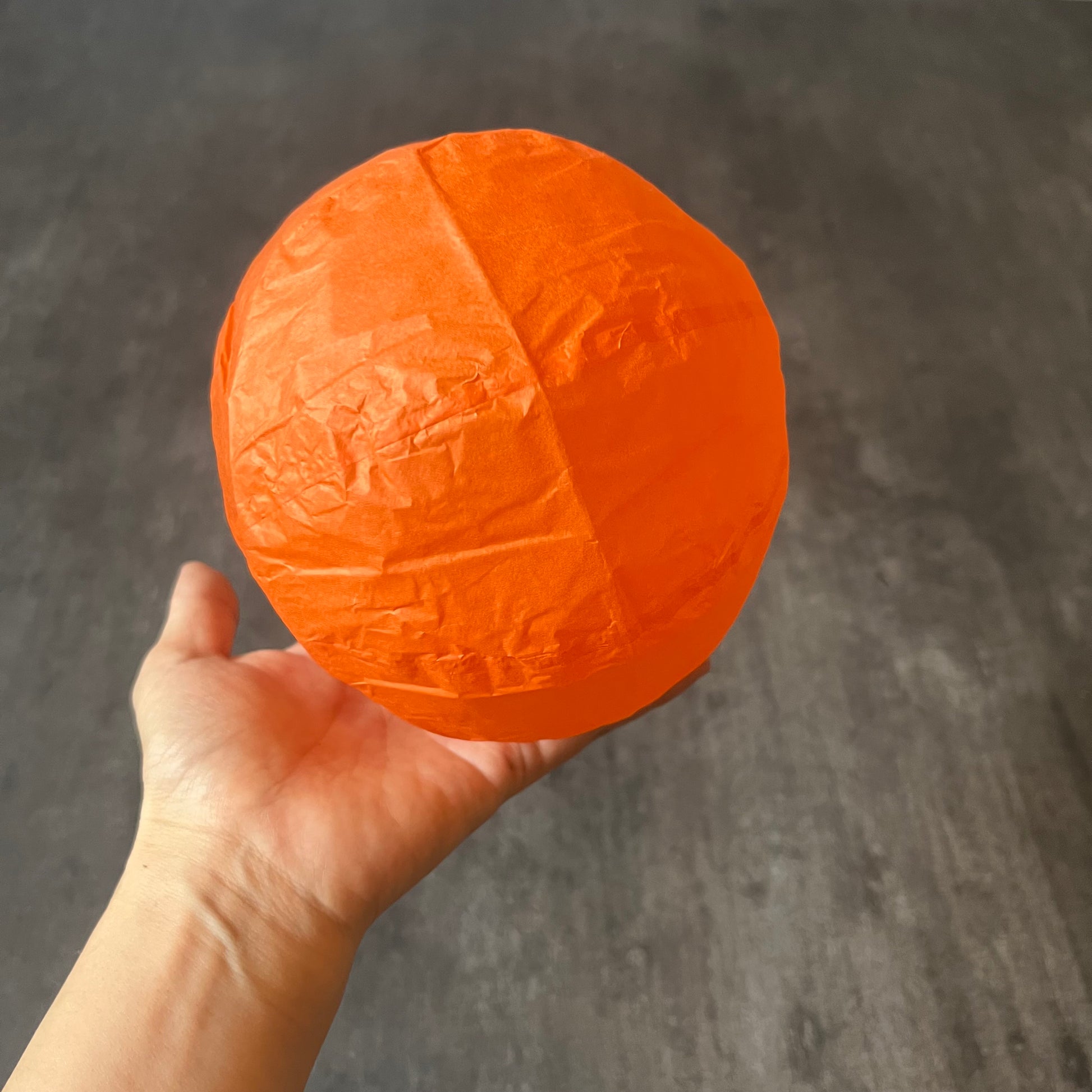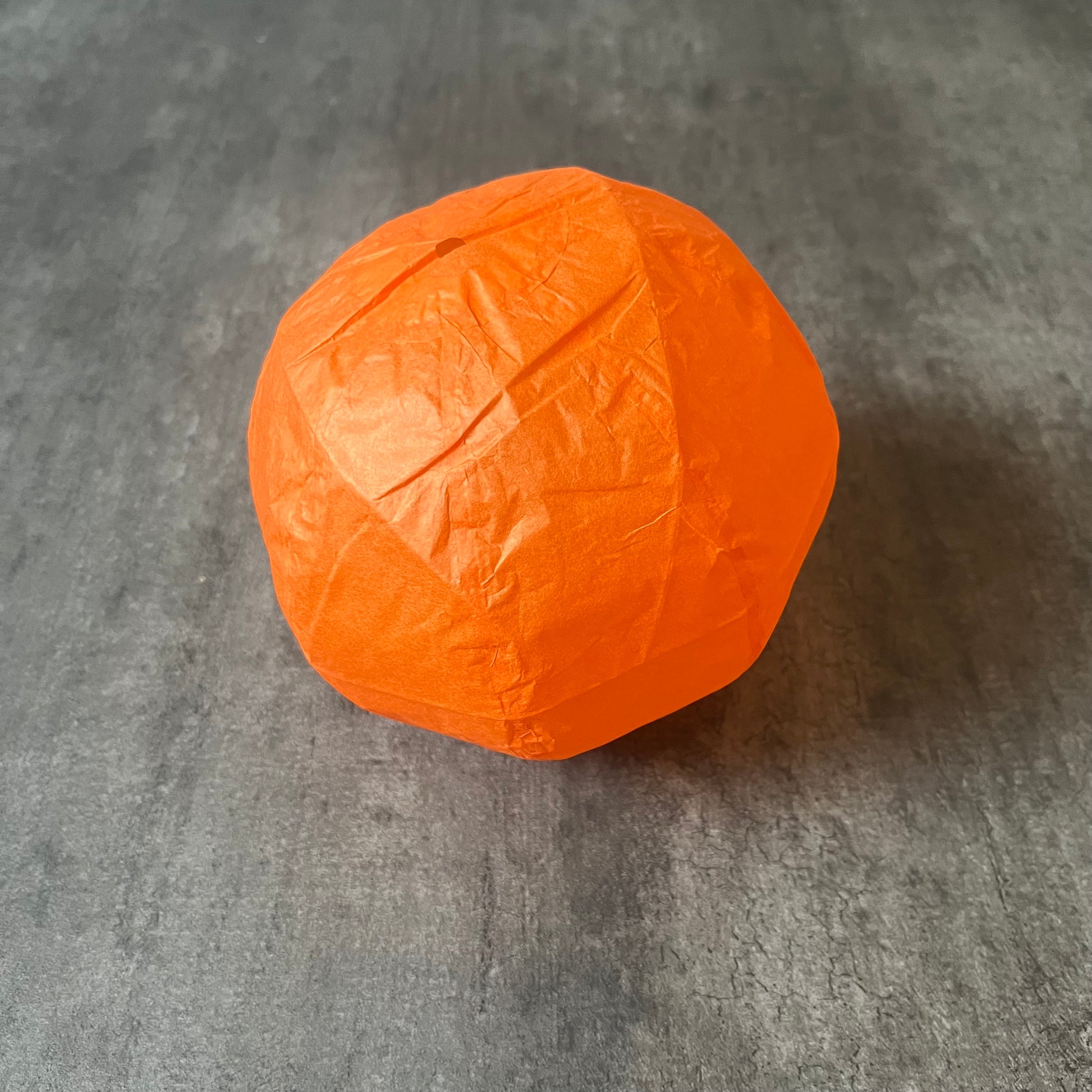 橙一色の紙風船。大変手間がかかる一色張り合わせ作業を行っています。