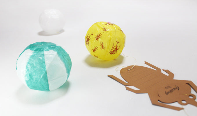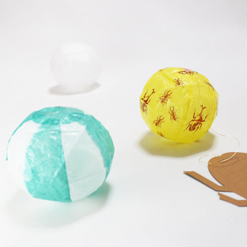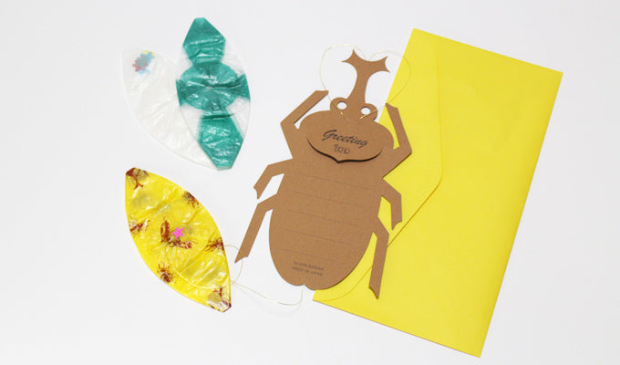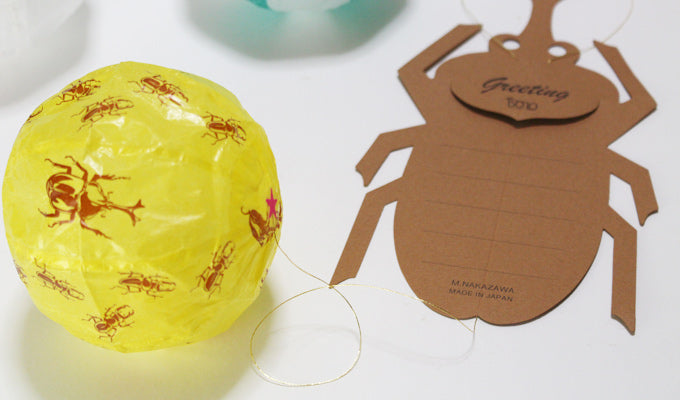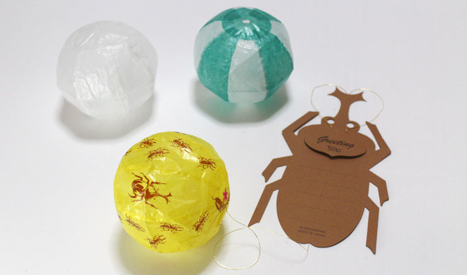かぶと虫の絵柄がかかれた紙風船1枚と無地の紙風船が2枚入っています。メッセージカードもついています。