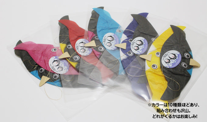 カラフルでファンシーなペンギン。親子の二枚組です。吊るし糸もついています。