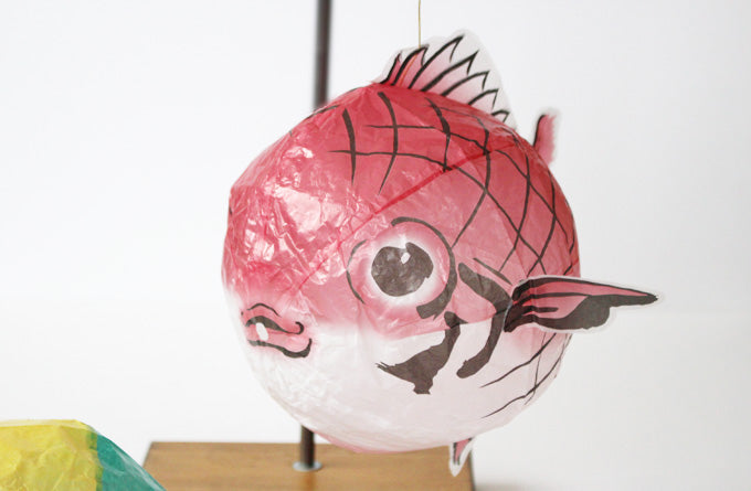 おめでたいときに飾って遊べるフォトジェニックな鯛の紙風船。千住札が必要な場合は、事前にお問合せください。吊り下げ糸のついた鯛の紙風船と、オーソドックスなタイプの紙風船、2枚入り。